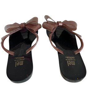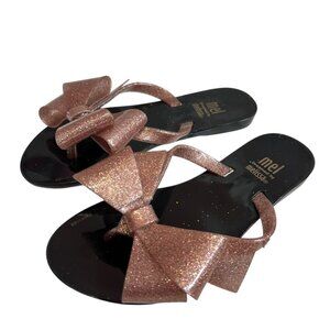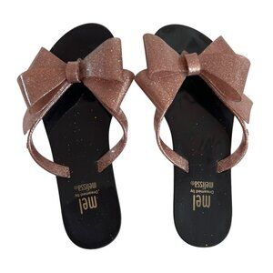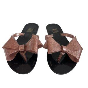 Melissa Harmonic Bow III Thong Sandals, black soles with glittery pink straps and bow, PVC jelly material, kids size 13, preowned and shows wear on the soles - see photos