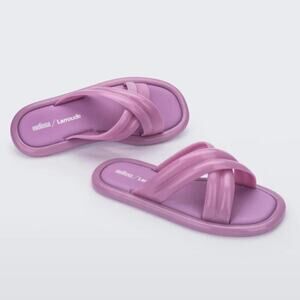 Melissa x Larroude Cali Slide in Lilac. Size 8. Features round toe, crisscross PVC upper, PVC sole, and slip-on. Style 33605-AC596-5. Excellent pre-owned condition.