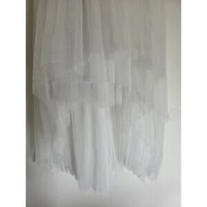 Red bodice with gold detail and black shoulder ties. White tulle layers in high-low design.