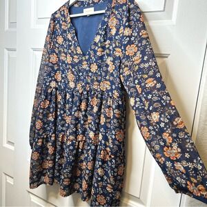 Keywords: Hazel & Olive, blue floral dress, long sleeve mini dress, babydoll dress, boho dress, bohemian style, floral print dress, womens dress, casual dress, fall dress, autumn dress, orange floral, tiered dress, v neck dress