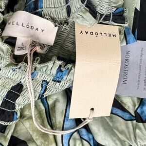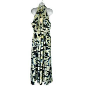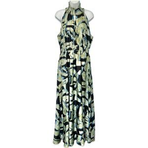 Melloday Green Blue Black Satin Abstract High Neck Maxi Dress size L NEW Tags
