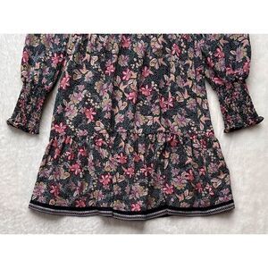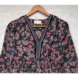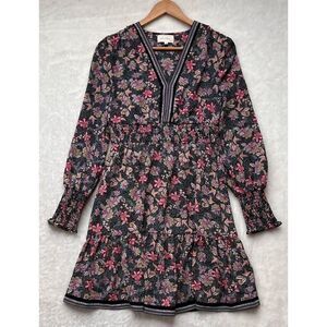 Bordered trim and smocked accents line this flouncy mini dress with allover florals.