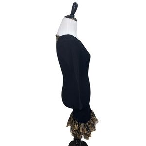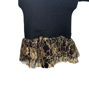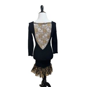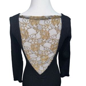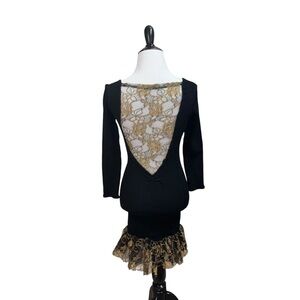 Mellow Mail New York City Women's Mini Dress. The tag states One Size Fits all, but the way it fits on my mannequin, I would say it fits like a small, possibly a small medium. Stretchy Bodycon Fit with an Open Back with a black and gold Lace Cut out , as well as a Lace trimmed hemline. The fabric is a Nylon Spandex Blend. Good Condition.