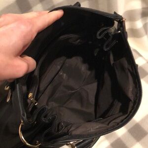 Mellow World ‘Soffi’ black handbag/carry-on. Woven design on front and gold-tone hardware. Fully lined with interior pockets. One exterior pocket, as well. Also comes with a shoulder strap. Measures 16x12x5 inches. Never used. Smoke-free home.