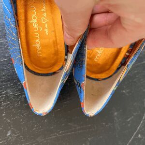 These vibrant Mellow Yellow heels feature a striking aquarium-inspired print with tropical fish, floral shapes, and underwater foliage in shades of blue, coral, and teal. The almond toe and 2.75" heel give them a wearable, polished silhouette, while the metallic orange insole adds a bold pop of contrast and personality.