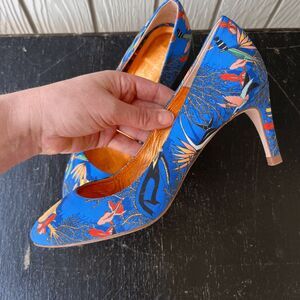 statement heels, tropical print, fish pattern, aquatic theme, novelty print pumps, French fashion, metallic insole, wearable art, surrealist style, dopamine dressing, maximalist, oceancore, whimsical chic, fun workwear, vacation shoes, artsy fashion, eclectic style, bold heels, French designer, colorful wardrobe, artistic footwear, retro pop art vibes, tropical glam, museumcore, quirky fashion, fashion-forward, unexpected color pairings, playful elegance, Y2K revival