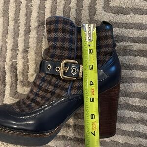 Unique and amazing quality boots by Mellow Yellow. Very comfortable despite the tall heel. Plaid wool and navy blue patent leather upper with wingtip design. Stacked heel. Zip at inside. Heel height 3.9 inches