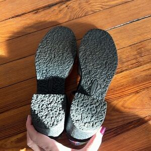 Gently used Mellow Yellow Paris silver/gray iridescent T-strap block heels with an adjustable ankle strap. These comfortable bock heels shimmer with different colors with the sunlight.