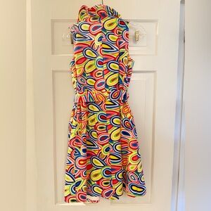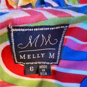 A discontinued style from Melly M, this party dress is fun! Multicolored and lively. A ruffle drops down the front of the wrap dress, covering the gold snap hardware that secures the wrap front. There are also hooks and eyes at the chest area to provide more coverage if desired. The ruffle at the top can lay flat or stand up for a popped collar look. This also comes with a removable belt and is lined. Worn to two daytime weddings, so it’s in excellent condition. Cotton.