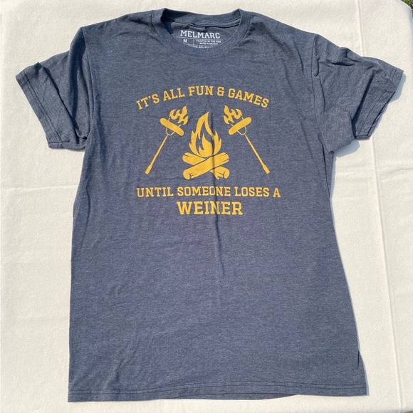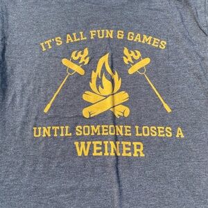 Enjoy a playful vibe with this gray t-shirt, featuring a fun yellow campfire graphic. Perfect for casual wear and lighthearted moments. “ It’s all fun and games until someone loses a wiener!”. In good lightly used condition with tons of life left! Soft cotton blend fabric.