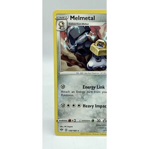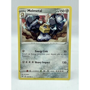 Up for sale is a Melmetal card from the Pokemon TCG set Darkness Ablaze. This Stage 1 Hex Nut Pokemon has 150 HP and is a Holo Rare with a regular finish. The card is in mint and unplayed condition, perfect for any collector or player. The card is made from high-quality card stock material and depicts Melmetal in full color, illustrated by NC Empire. The card number is 130/189 and the language is English. This is a great addition to any Pokemon TCG collection!