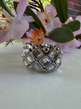 Delicate gold-tone snake-chain style bangle with two cross charms, floral spacers, and a rhinestone halo medallion. Slip-on stretch design for easy wear and stacking.✝️💛✨