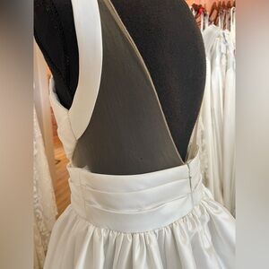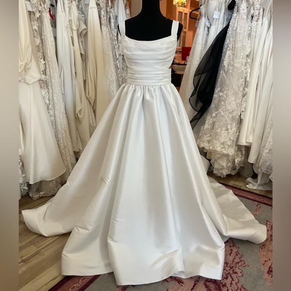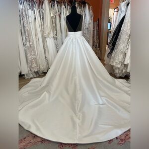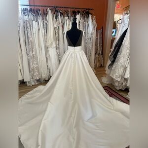Gorgeous ivory satin A-line gown with ruching all around, square neck line, large train, deep V cut out open back with nude meshing