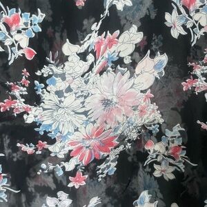 Beautiful floral kimono, with a ruffle hem, is is designed on a black background, and can be worn for either a casual beach day or date night or evening event. From the center, the open front measures at 32 inches. The back measures at 47 inches long. It's 100 %Polyester.