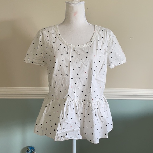 Adorable peplum blouse with stars pattern. Most of the stars are black with a few burgundy ones! Pair with slim black pants or jeans!