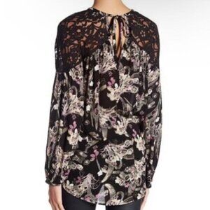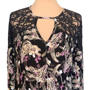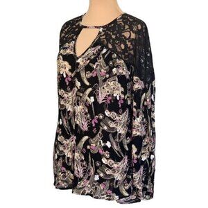 Melrose and Market Floral Blouse Sz.L Black Lace Cutouts Keyhole Whimsigoth Boho