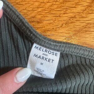 This green one-shoulder long-sleeve Melrose and Market top (size M) has vertical textured stripes. It is unlined and made of very comfortable material!