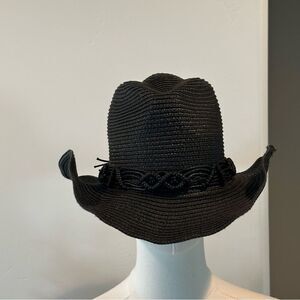 New with partial tags! Never worn! Packable! Elevate your look with this cool western hat crafted from straw and fashioned with an intricately braided band.