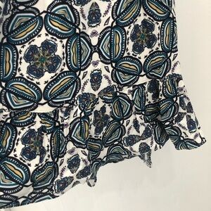 Melrose and Market printed top size small. Top has a very pretty design with white, green, yellow, blue and yellow colors. The top features a ruffle detail on the bottom.