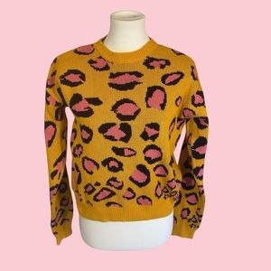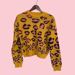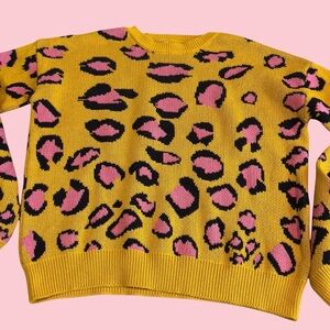 Leopard print crewneck sweater with ribbed knit cuffs. Vibrantustard yellow and pink - perfect for adding a pop of color to your wardrobe. 100% cotton.