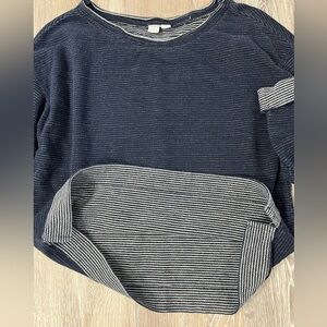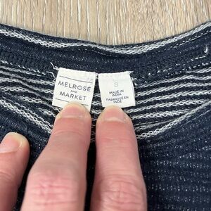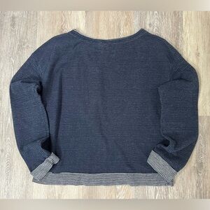 Melrose and Market soft & cozy navy 100% cotton long sleeve knit top size small. A great cross between a sweater and a sweatshirt. Subtle blue on blue stripes on body and sleeves. Cuffs and bottom hem are blue and white striped. Great condition, no visible holes or stains. Measures approximately 20” across chest, 22” length.