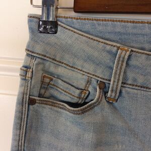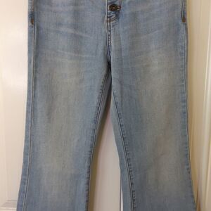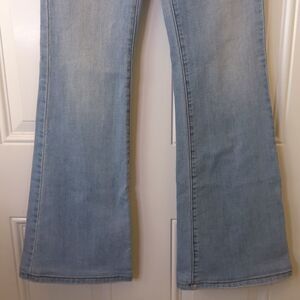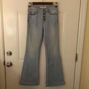 Melrose and Market light wash five pocket button front flare leg jeans.