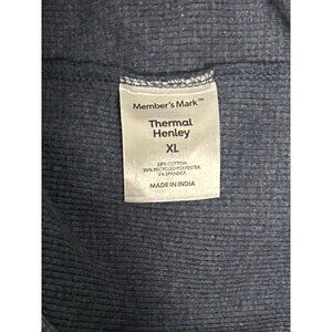 This is a Men's Member's Mark long sleeve thermal Henley shirt in size XL. The shirt is solid blue with a regular fit and features a Henley neckline. It is made of a cotton blend fabric with added spandex for stretch. This cozy and warm shirt is machine washable and suitable for all seasons.