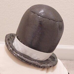 Skeleton wears a shiny silver sparkle top hat