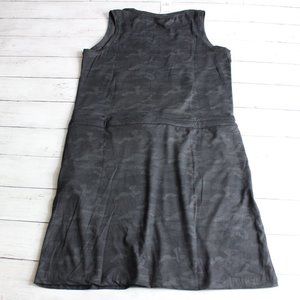 This sleeveless pull-over athleisure dress is black and dark charcoal gray camouflage print. It has a scoop neck with an adjustable drawstring waistband and side pockets. It is so soft and comfy and is brand new with tags.