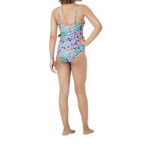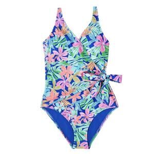 The Member's Mark Women's Wrap-Style One-Piece Swimsuit in size Large is a comfortable and stylish option for women looking for a beach or tropical-themed swimsuit. Made of 84% polyester and 16% spandex, this one-piece features a bra strap for support and an adjustable strap for a perfect fit. With removeable pads and a breathable design, it offers comfort and ease of care with its machine washable material. Perfect for a day at the beach or pool, this swimsuit combines style and practicality for a great summer look.