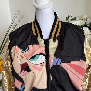 Vibrant bomber jacket with a playful cartoon design. Features gold sleeves and a black body.