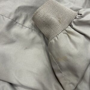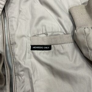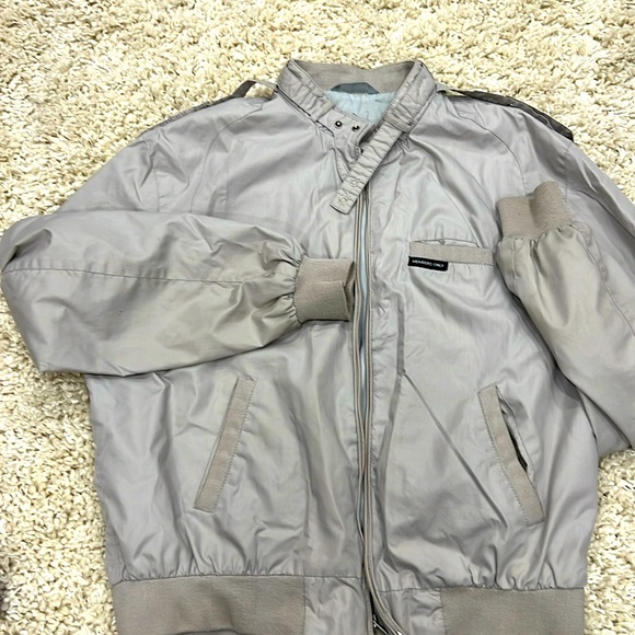 Vintage Members Only Classic Iconic Racer Jacket in light gray. Minor stains on one sleeve and mark on the back (shown in pics) and inside pocket has been repaired hand stitched (also shown in pic). Size 46 or mens medium.