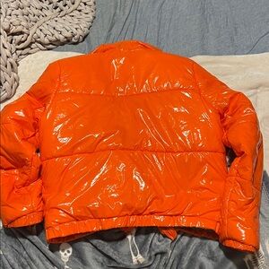 Bold orange jacket with a blue logo patch. Eye-catching and stylish.