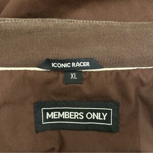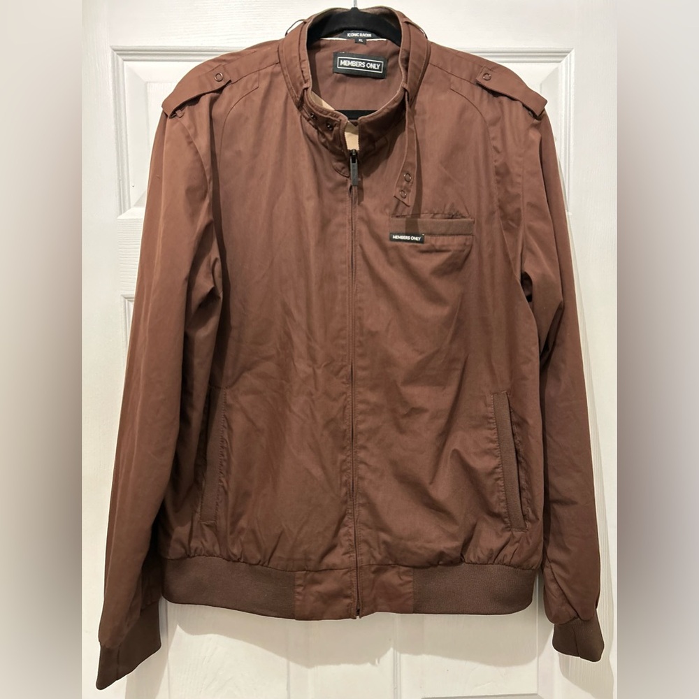 Members Only Iconic Racer brown jacket perfect for any occasion. Comfortable fit with a sleek design. (Has a little wear on the inside part of the neckline as shown in the picture.)
