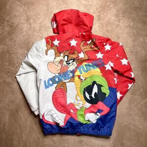 Members Only Looney Tunes Windbreaker Jacket Red White Blue Stars Zip Up Hooded