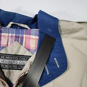 Members Only Mens Embroidered Logo Jacket Large Tan w/Plaid Lining Epaulets READ