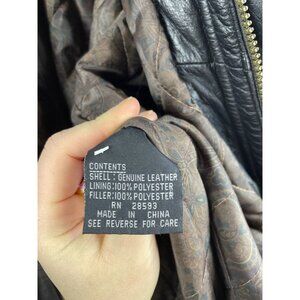 Description : 100% leather shell outer. Bomber style with multiple snap pockets. Full zip front. Quilted lining.