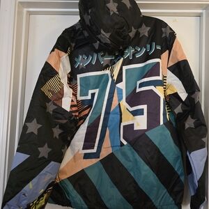 Stand out with the Members Only multicolor graphic jacket. This vibrant piece combines style and comfort, perfect for any casual outing. Windbreaker style with side pockets and hood