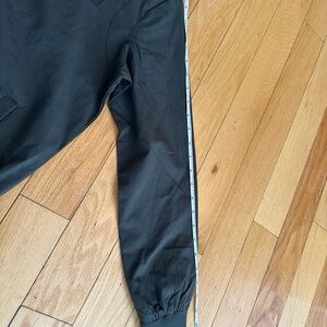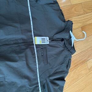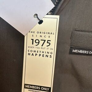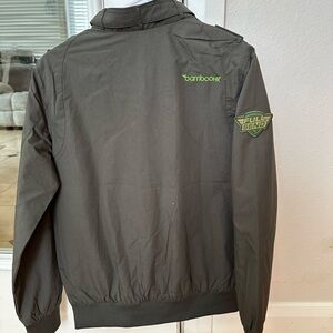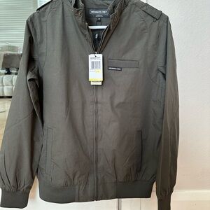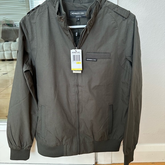 Classic olive jacket with a sleek design. Features a zip front and chest pocket. Ideal for versatile styling. Includes patches from my work, but they can be easily taken off. I wish it fit me!