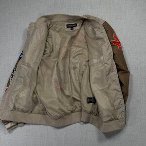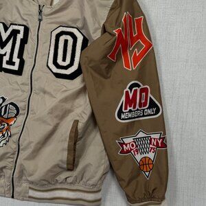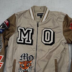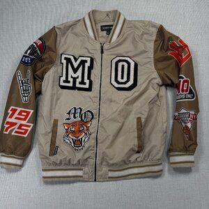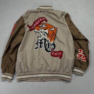 Members Only Varsity Bomber Jacket Beige Brown Patches Tiger Graphic Size L