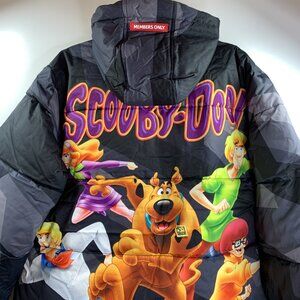 From the official Members Only and Scooby-Doo collaboration comes this puffer jacket in a gray/black colorway, adorned with Scooby graphics on the front and back so you can boast your favorite cartoon. This style offers full zip closure, a collar and hood with toggles, slash front pockets and an elastic waist and cuffs with adjustable velcro straps. Insulated. Machine Washable.
