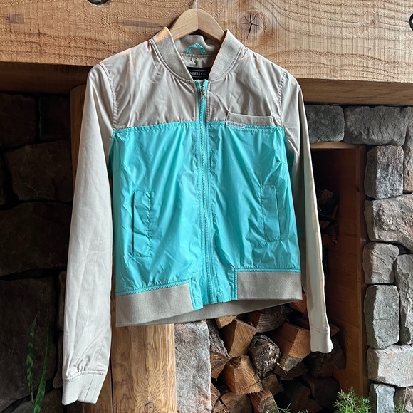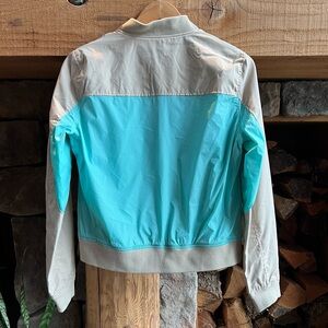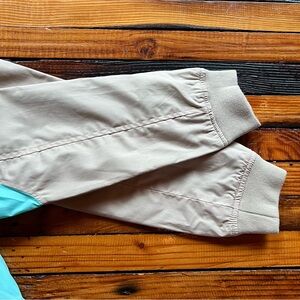 ‘Khaki and Baby Blue’ colors, two side pockets and one inside pocket and one chest pocket. Full zip, elastic waist.