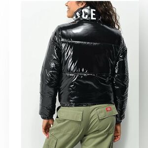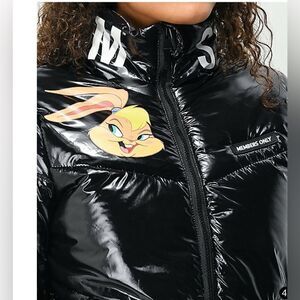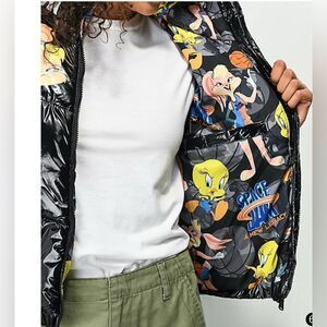 This shiny black jacket comes with a mock neck collar and classic puffer construction for serious coziness points, while the mixture of Looney Tunes graphics throughout the interior finish things off in style.