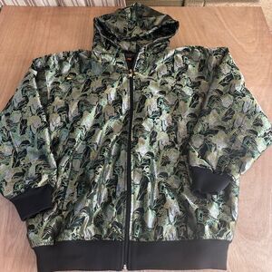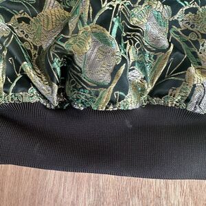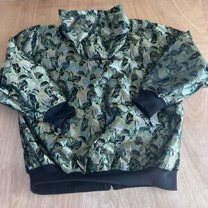 Statement-making Member’s Property men’s hooded jacket in size 4XL. This eye-catching piece features a metallic brocade shell with a black, gold, and green Asian-inspired motif — luxurious texture with a streetwear twist.