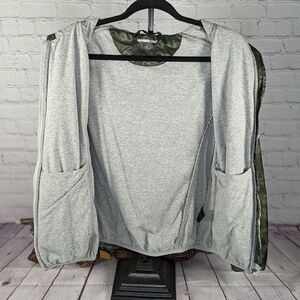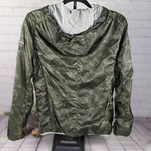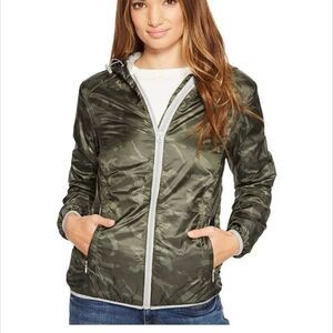A lightweight woven windbreaker by Members Only™ featuring a camo print, toggled drawstring hood, front zip closure, on-seam zip pockets, long sleeves, contrast knit trim, heathered knit lining with interior slip pockets.