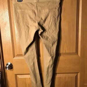 Memoi Tan Stretch leggings Jean like material L/XL elastic waistband, front has M logo button for looks only, front and back pockets are for looks