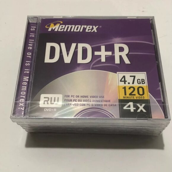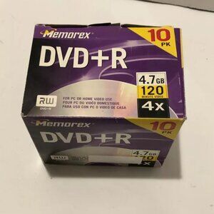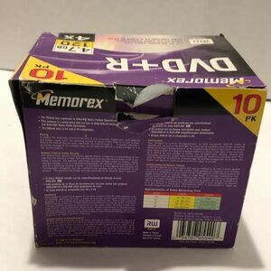 Box is preowned, originally a 10 pack. 6 pcs left. Memorex DVD+R DVDs. Remaining pcs are sealed. 4.7 GB, 120 Minute 4x RW. OUter box has wearing.