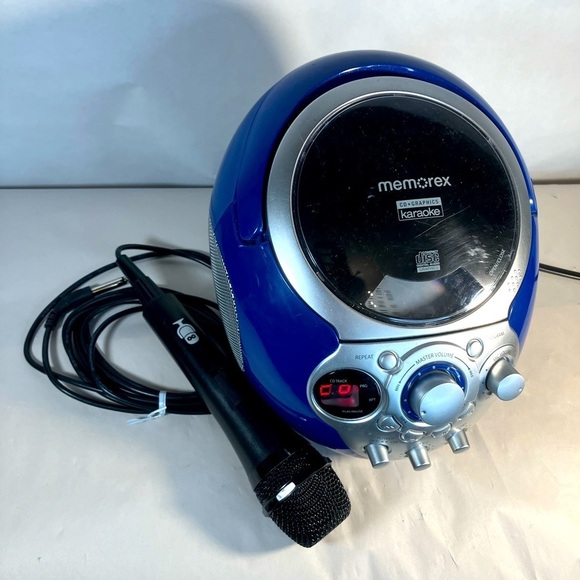 Memorex model MKS5215 portable karaoke CD player. Includes a microphone, audio/video cable and a/c power cable.