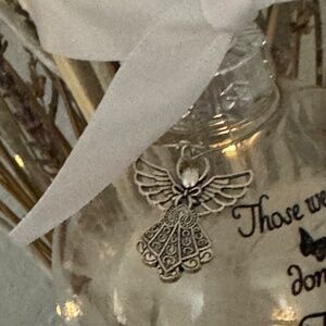 This ornament is a clear plastic ball filled with white feathers, topped with an angel that hangs near the comforting phrase. It also includes a white ribbon for hanging.