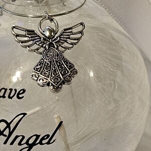 Inside the ornament is white feathers, a bow on the outside placed on the ribbon hanger as well. Angel moves around on a clip, too.